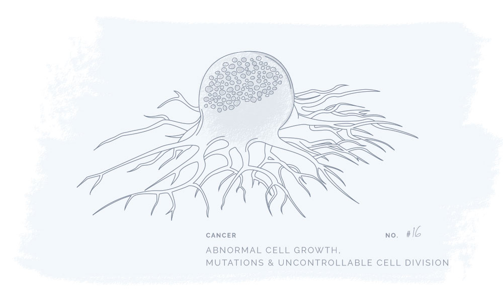 Cancer is a group of diseases that involves the growth of abnormal cells which contain mutations leading to uncontrollable cell division and growth. This can take place in any cell type and damage/destroy normal tissue.